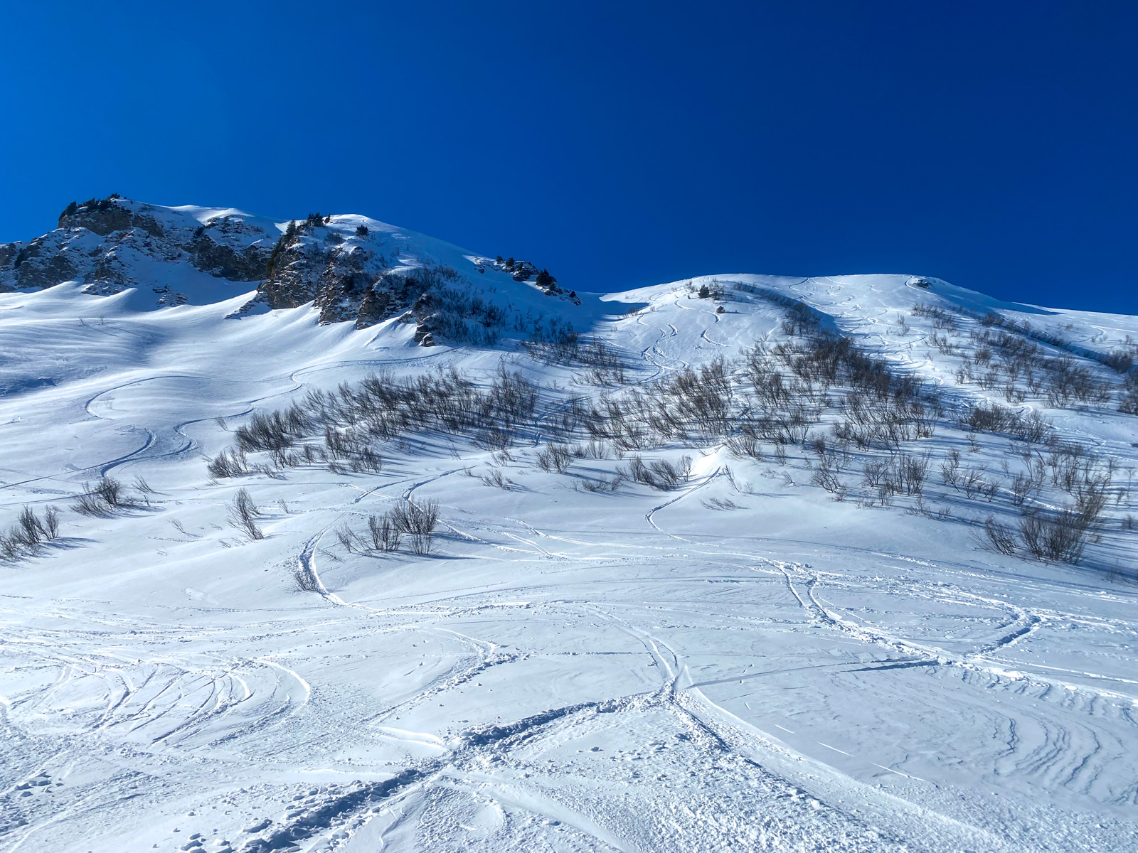 Enfin de la neige fraîche ! Pas beaucoup, mais juste assez pour se faire plaisir en pleine semaine avec un magnifique soleil en plus ! Alors on s’organise le jour d’avant pour une petite reconnaissance et on se dit que ça va être pas mal du tout.